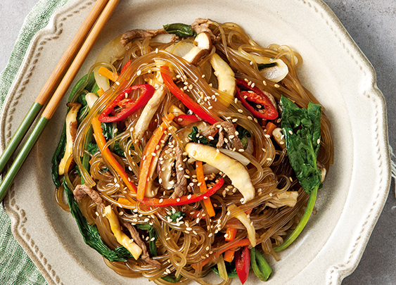 - 완성된 잡채를 접시에 담아 참깨를 뿌려주세요.